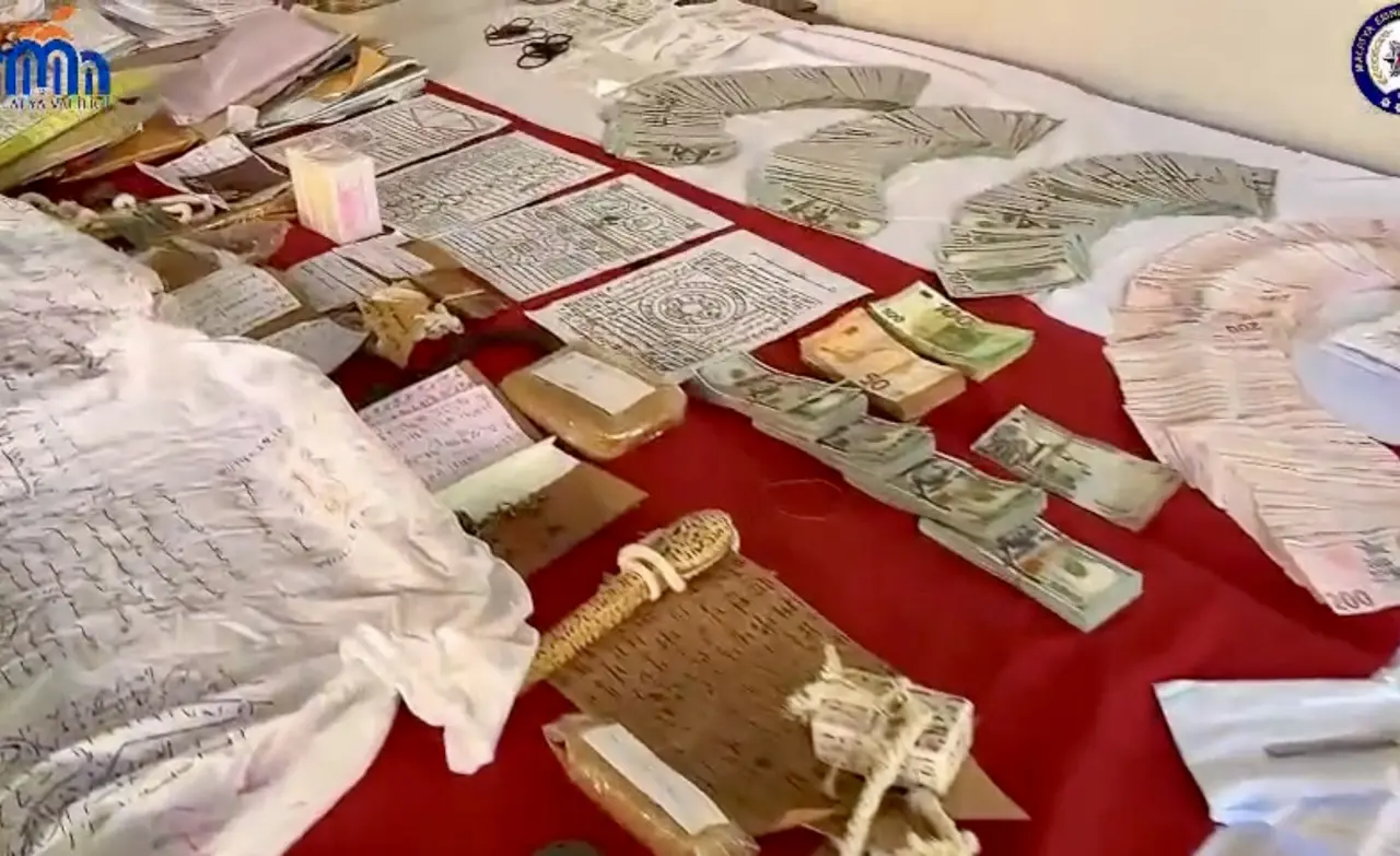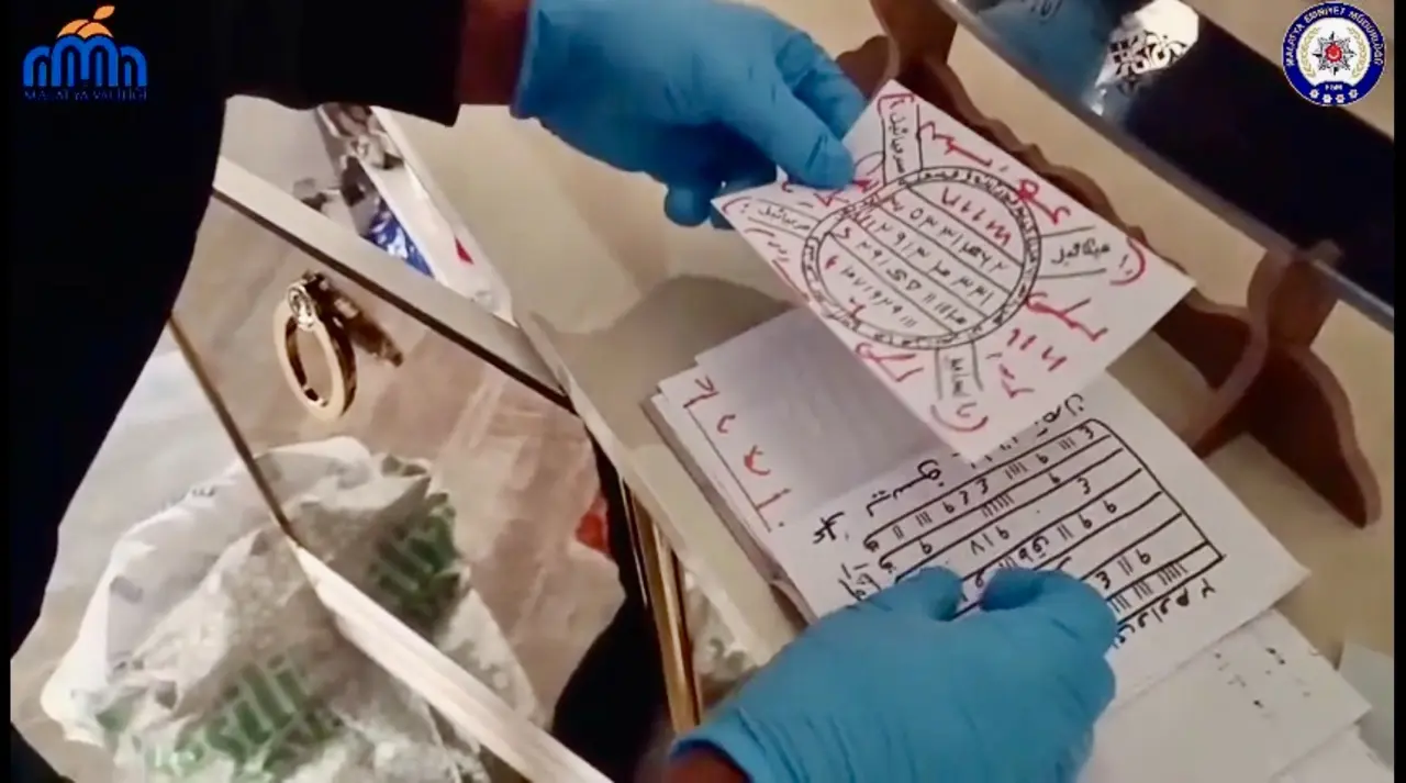 Operasyon kapsamında şüphelilerin evlerinde, üzerinde Arapça ve eski yazılar bulunan ceylan derisi, yılan derisi, tahta kaşık, bez, çaput, atlet, at nalı, sabun gibi sözde büyü materyalleri ile 100 bin dolar nakit para ele geçirildi.