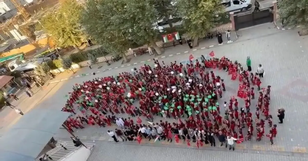 Öğrenciler, Türkiye haritası şeklinde oluşturulan platformda Filistin bayrağının renklerinden bir koreografi gerçekleştirerek dayanışmayı simgeledi.