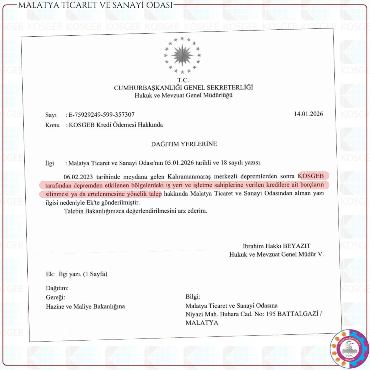 Cumhurbaşkanlığı Genel Sekreterliği Hukuk ve Mevzuat Genel Müdürlüğü tarafından 14 Ocak 2026 tarihli yazıyla, MTSO’nun 5 Ocak 2026 tarihli ve 18 sayılı talep yazısı değerlendirilerek, konunun Hazine ve Maliye Bakanlığı’na incelenmek üzere sevk edildiği bildirildi. Yazıda, deprem sonrası bölge ekonomisinin karşı karşıya kaldığı finansal yükler dikkate alınarak, KOSGEB kredi ödemelerine ilişkin talebin Bakanlık nezdinde ele alınmasının uygun görüldüğü ifade edildi.