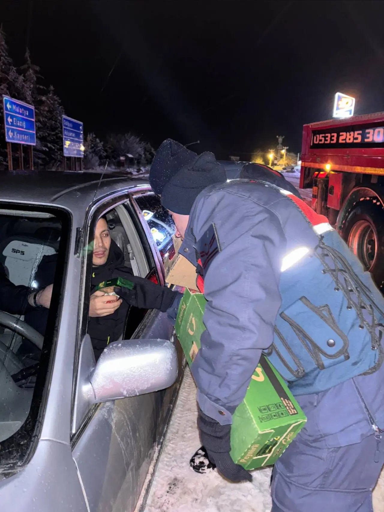 Doğanşehir İlçe Jandarma Komutanlığı ekipleri, olumsuz hava koşulları nedeniyle yolda ilerleyemeyen sürücülere ve otobüslerdeki yolculara ulaşarak yiyecek dağıttı. Vatandaşların temel ihtiyaçlarını öncelik olarak ele alan ekipler, soğuk kış gününde vatandaşın içini ısıtan bir hizmete imza attı.