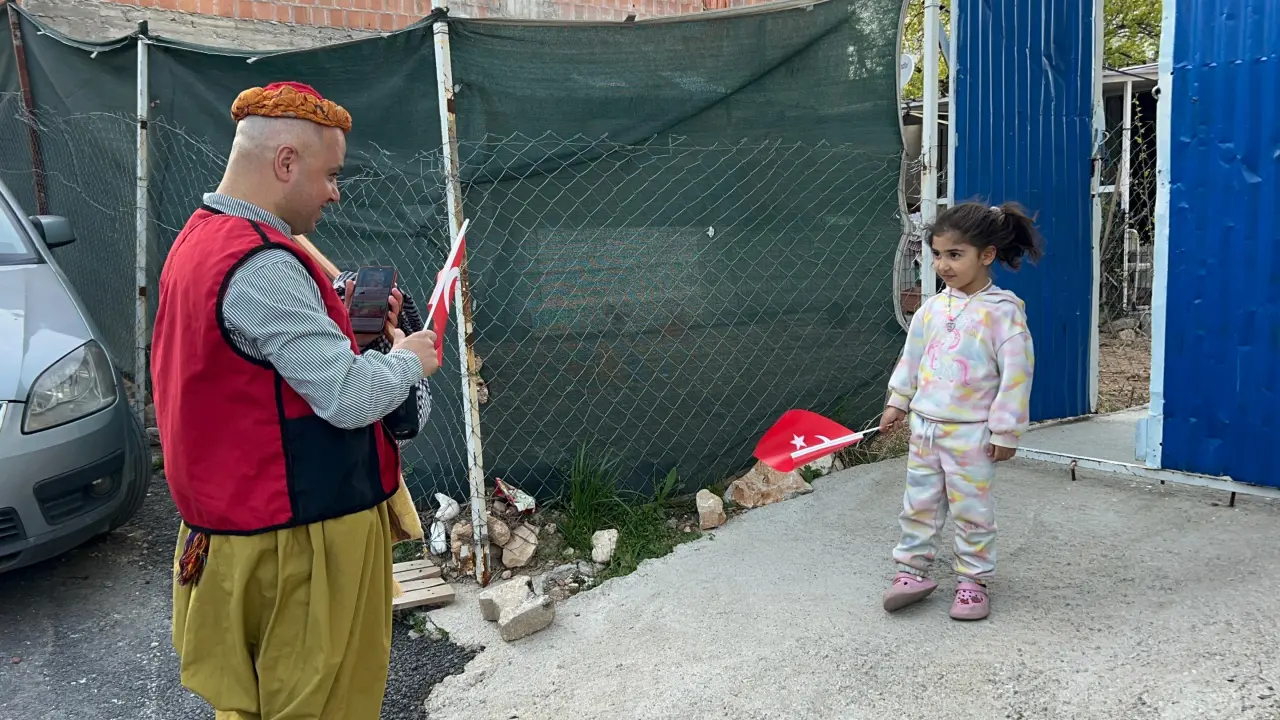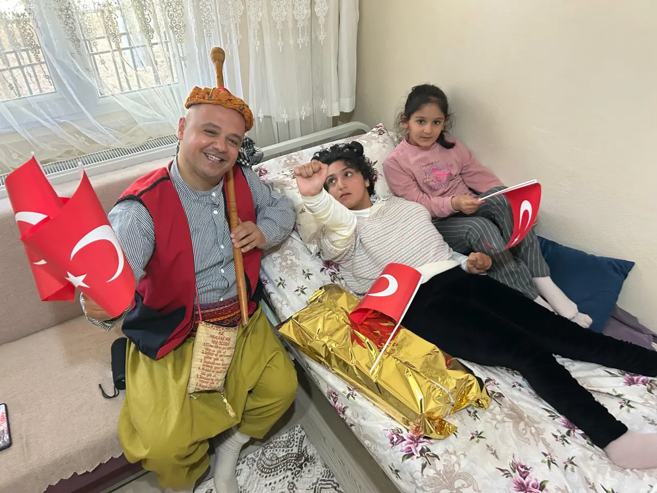 Keloğlan kostümü giyen Konakçı, dışarı çıkma imkanı bulunmayan çocukları evlerinde ziyaret ederek bayram sevinci yaşattı. Ziyaretlerde çocuklara hediyeler veren Konakçı, ailelerle de bir araya geldi.