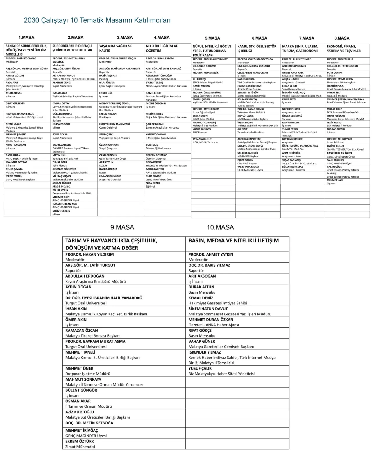 Çalıştay kapsamında belirlenen 10 tematik masada, Malatya'nın karşılaştığı sorunlar ve çözüm önerileri detaylı bir şekilde ele alındı. Her masadan çıkan fikirler, ortak bir akıl sürecinin ürünü olarak değerlendirildi.