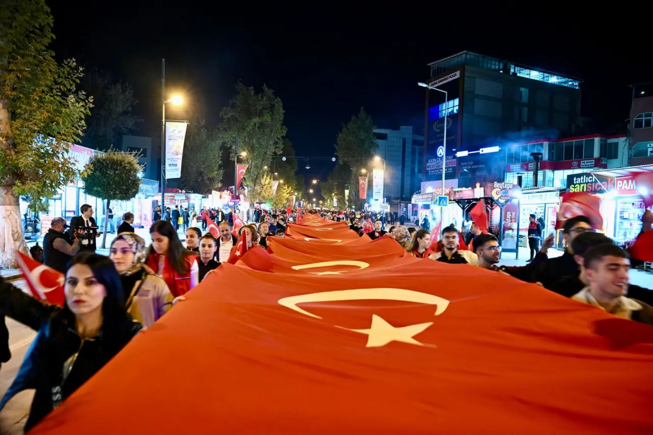 Malatya'da Cumhuriyet'in 102. yılı, coşkuyla kutlandı. Vatandaşlar, dev Türk bayrağıyla yürüyerek, 2. Ordu Bando Takımı eşliğinde kortejde yer aldı.