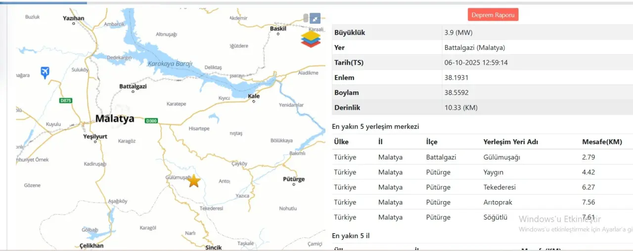 AFAD’ın internet sitesinde yer alan bilgilere göre, saat 12.59’ta kaydedilen depremin merkez üssü Battalgazi olarak belirlenirken, sarsıntı 10,33 kilometre derinlikte gerçekleşti.