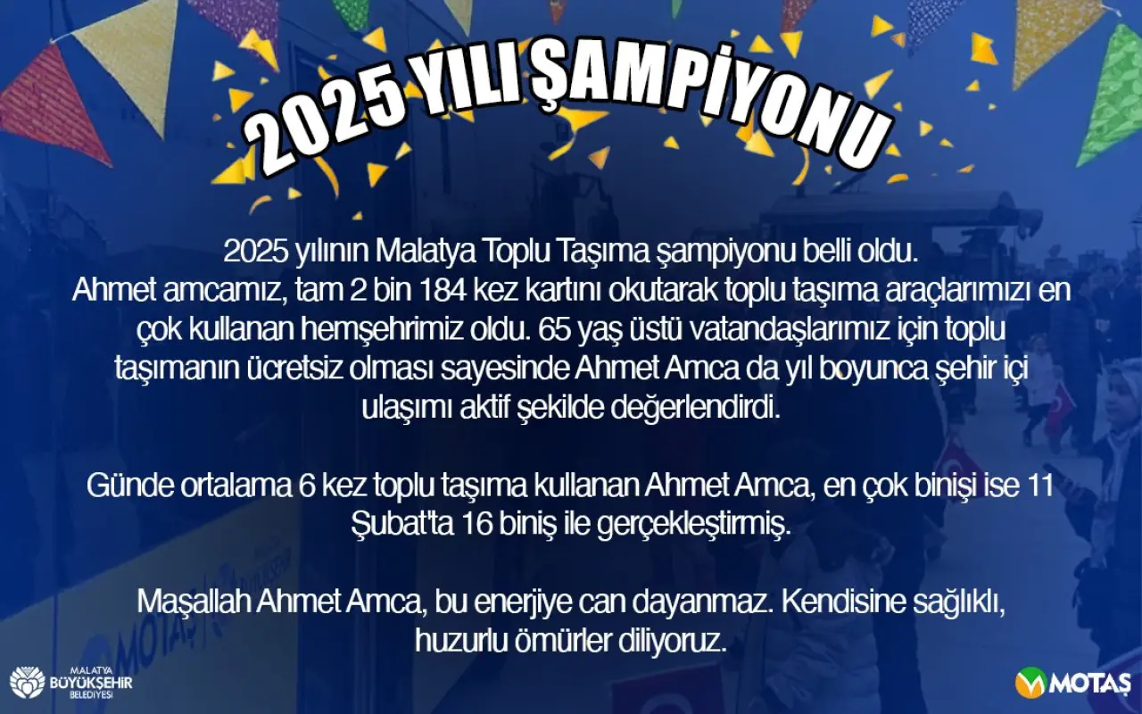 Malatya Büyükşehir Belediyesi’nin toplu taşıma şirketi MOTAŞ, 2025 yılına ilişkin toplu taşıma kullanım verilerini kamuoyuyla paylaştı. Açıklamaya göre kent genelinde toplu ulaşımı en aktif kullanan vatandaş, yıl boyunca kartını tam 2 bin 184 kez okutan Ahmet isimli vatandaş oldu.