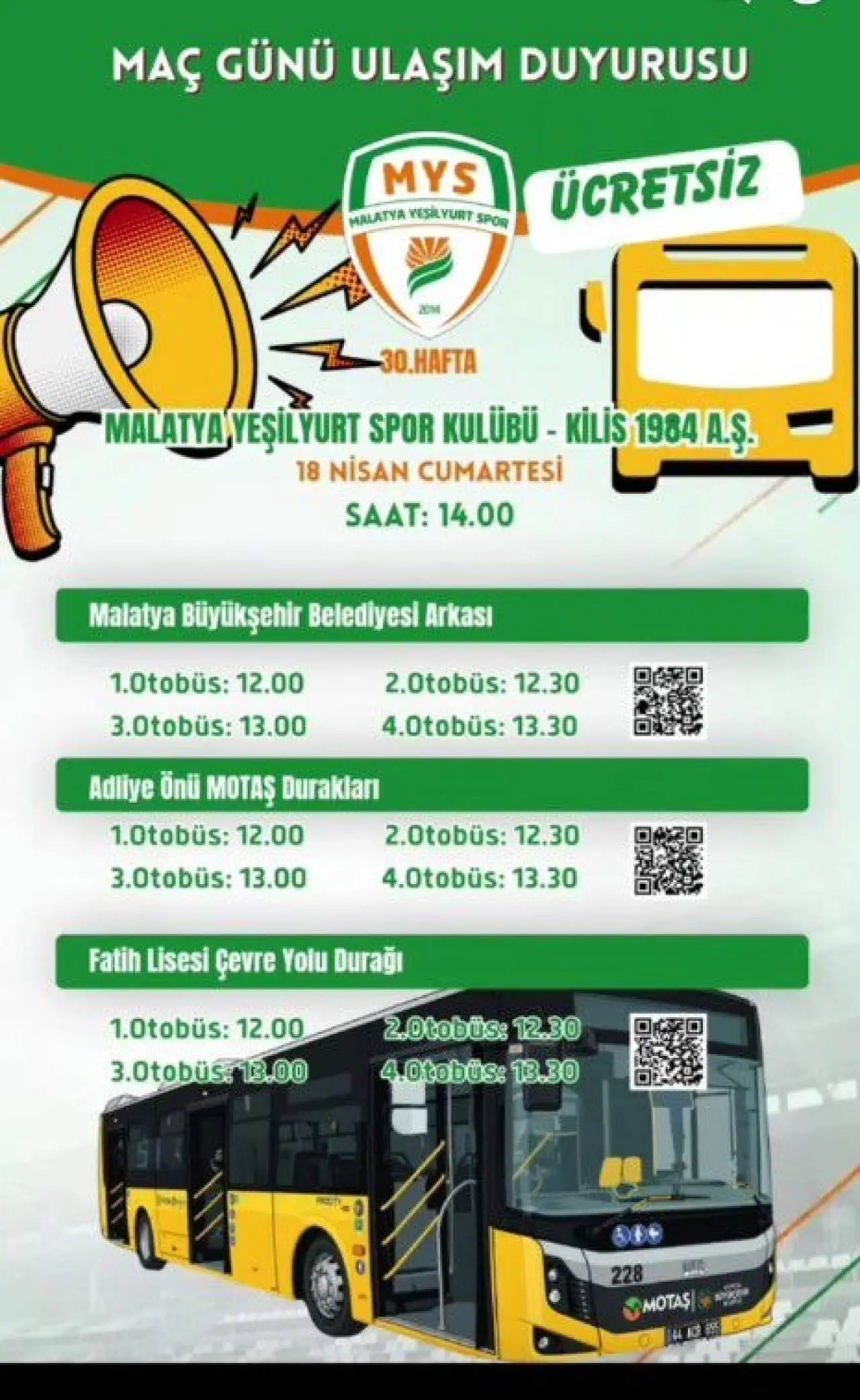 Yeşilyurtspor'un Kilis 1984 Spor karşısında alacağı galibiyetle Play-Off'u garantileyeceği belirtildi. Bu nedenle ücretsiz ulaşım uygulamasının büyük ilgi görmesi bekleniyor.