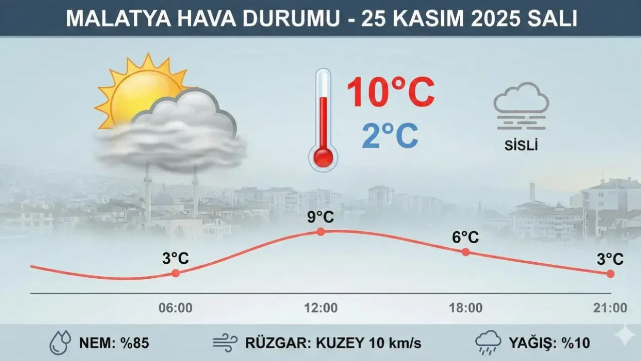 25 Kasım 2025 tarihli Malatya hava durumu grafiği, ve 10 derece sıcaklık göstergesi
