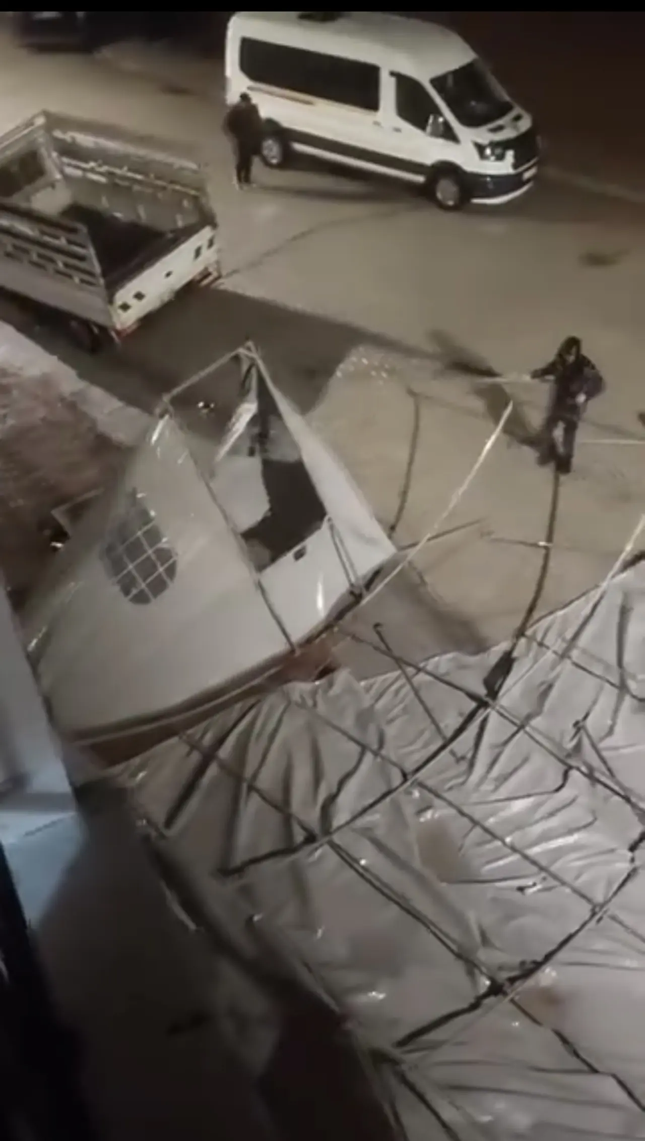 Olumsuz hava koşulları nedeniyle TOKİ 2. Etap’ta kurulu bulunan taziye çadırı, şiddetli rüzgârın etkisiyle yerinden sökülerek uçtu. İçindeki sandalye ve malzemeler ile birlikte savrulan taziye çadırında hasar meydana geldi.