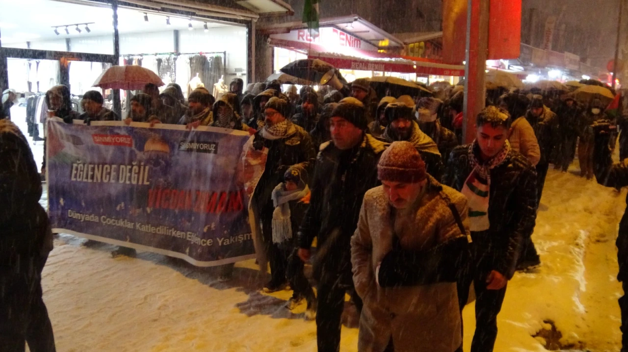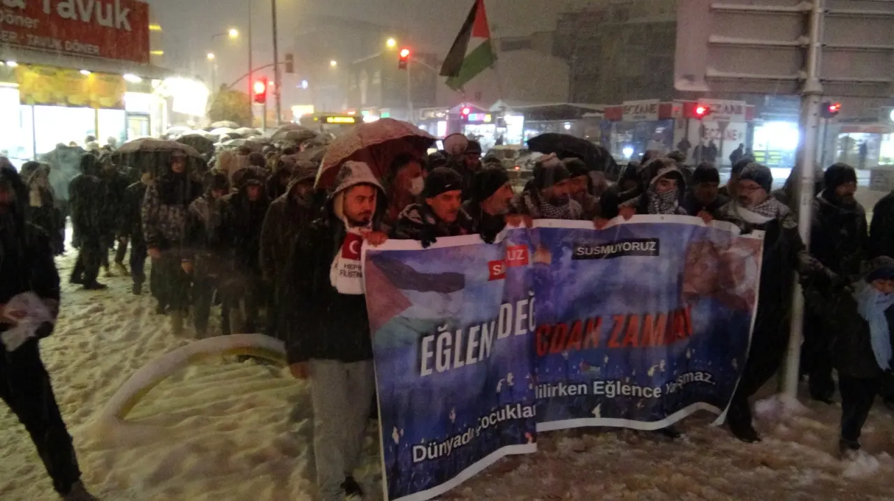 Malatya’da Kudüs Kardeşlik Platformu öncülüğünde bir araya gelen yüzlerce vatandaş, Gazze’de yaşanan insanlık dramına dikkat çekmek için yürüdü. Yılbaşı eğlencelerine tepki gösterilen eylemde, "Zulüm varken sessizlik normalleşmektir, eğlence değil vicdan zamanı" mesajı verildi.